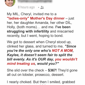 On Mother’s Day, my mother-in-law handed me a $367 dinner check and said, “This is your gift to the real moms at the table.” I smiled, paid…
