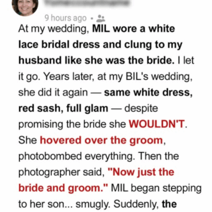 At my wedding, my mother-in-law showed up in a full-length white lace gown, clinging to my husband like she was the bride. I tried to let it…