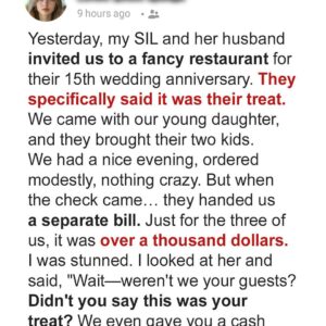 Sabine, her husband David, and their daughter Ella were invited by SIL Amanda to a fancy anniversary dinner—“our treat.” They brought a $200 gift and ordered modestly,…
