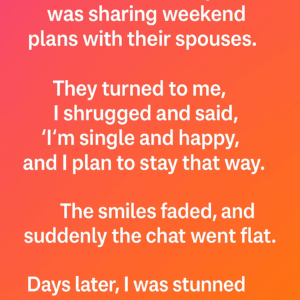 Here is my story. At the office, everyone was sharing weekend plans with their families. They turned to me, I shrugged and said, “I’m single, happy, and…