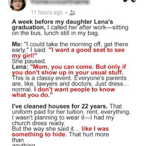 A week before my daughter Lena’s graduation, I called her after my housekeeping shift, still wearing my uniform and sitting tired on the bus. I excitedly told…