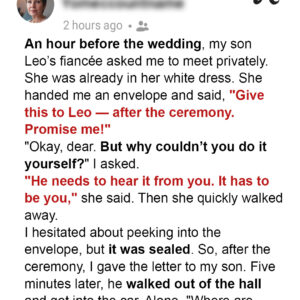 An hour before my son Leo’s wedding, his fiancée pulled me aside. She was already in her dress, looking nervous yet determined. She pressed a sealed envelope…