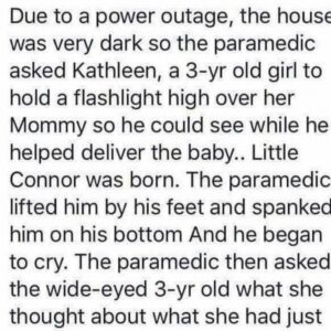 During a power outage, a paramedic had to deliver a baby in a dark house and asked Kathleen, a wide-eyed 3-year-old, to hold a flashlight over her…